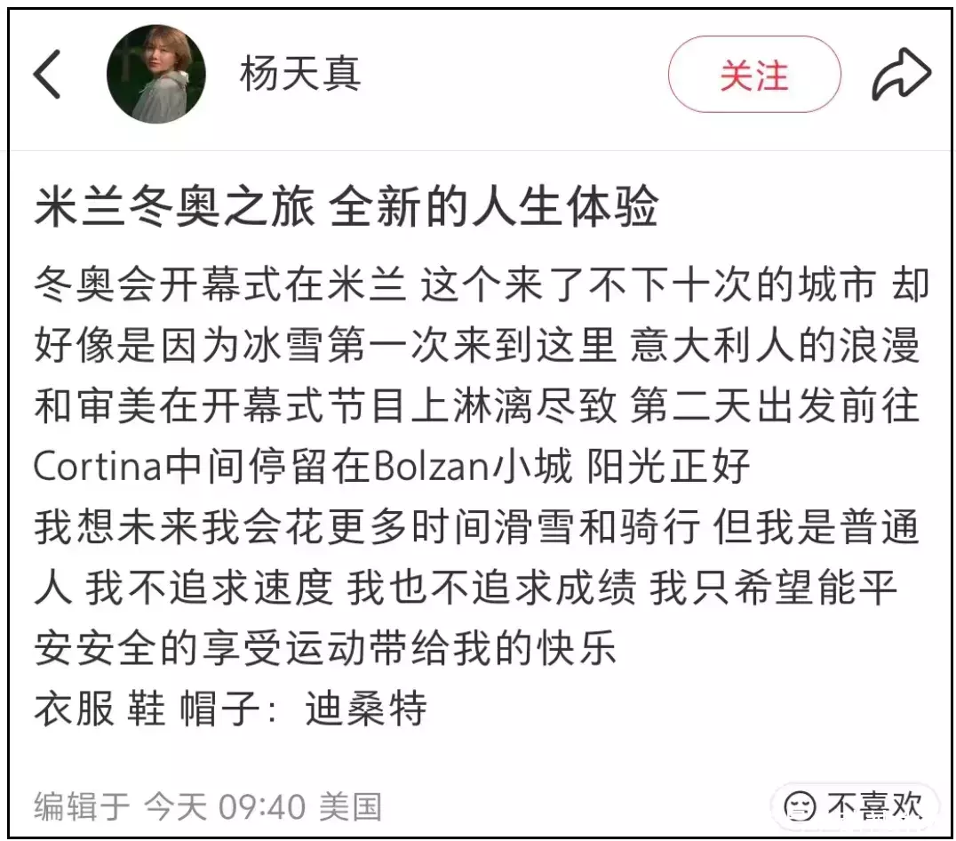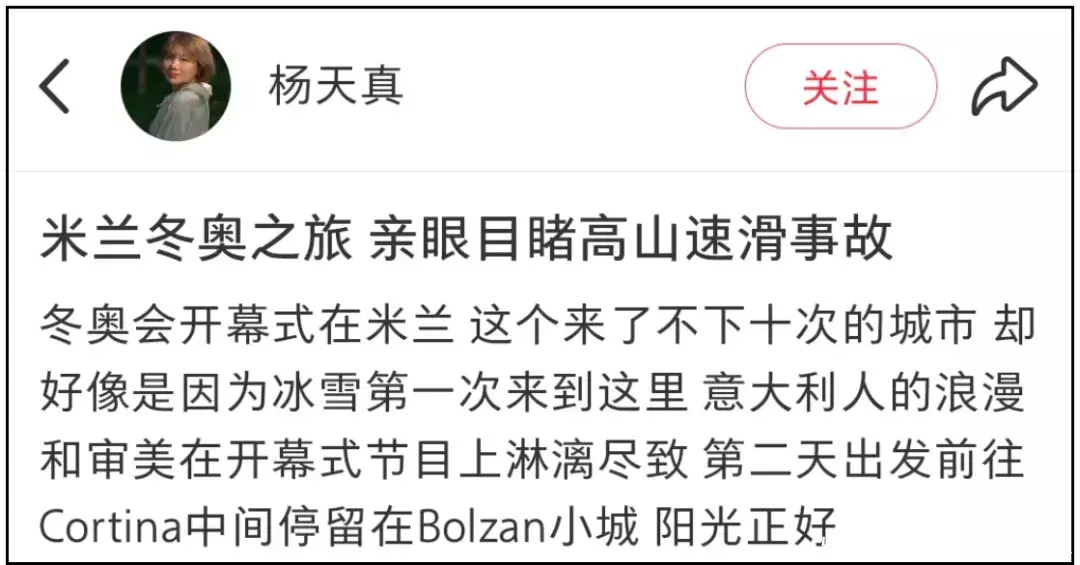 只见杨天真社媒动态标题直接就写着“米兰冬奥之旅,亲眼目睹高山速滑事故”,还配了一大段长文和多张live图。