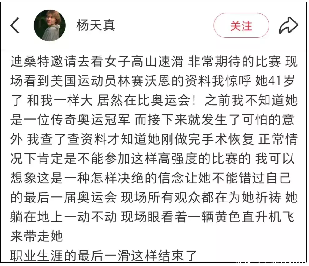 最近第二十五届冬季奥林匹克运动会在意大利米兰如火如荼举行,知名业内杨天真在现场观看了比赛,目睹41岁高山速滑运动员林赛·沃恩重伤下场,并把事故现场分享到了社媒之上,很快引发争议。