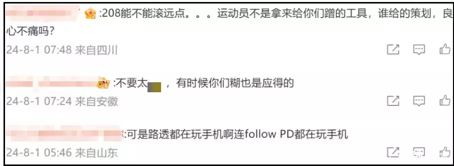 ——大屏幕上的张博恒面对成绩满脸失意,周雨彤笑容满面在观众席比赞,鲜明对比之下,周雨彤迅速遭到质疑,《花儿与少年》节目账号评论区也沦陷了。